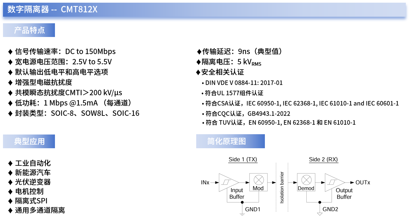 在应用领域方面,CMT812X系列容耦隔离器已广泛应用于工业自动化、新能源汽车、光伏逆变器、电机控制、隔离式SPI以及通用多通道隔离等场合。CMT812X系列芯片可在通信过程中实现两路通道隔离,确保数据信号安全传输,特别是在工业应用中,可有效防止噪声干扰,保证工业设备的稳定运行。