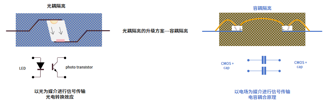 传统光耦隔离器的工作原理为通过发光二极管(LED)将来自MCU的直流脉冲信号(数字信号)转为光信号,经PI透明介质隔离后,再由光敏元件接收光信号,而后产生电导率变化,进而将其还原为原来的数字信号。虽然光耦隔离器技术成熟度较高、成本较低,但由于存在LED光衰、运行功耗大与传输速率低等固有缺陷,其在高速通信与能效敏感的场景中渐显乏力。