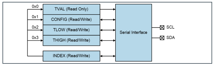 T09的寄存器组由TVAL(温度寄存器-只读)、CONFIG(配置寄存器-读/写)、TLOW(最低温度报警寄存器-读/写)、THIGH(最高温度报警寄存器-读/写)以及INDEX(索引)所组成,用户主机可通过I²C总线接口访问这些寄存器以配置T09的运行模式或获取温度信息。