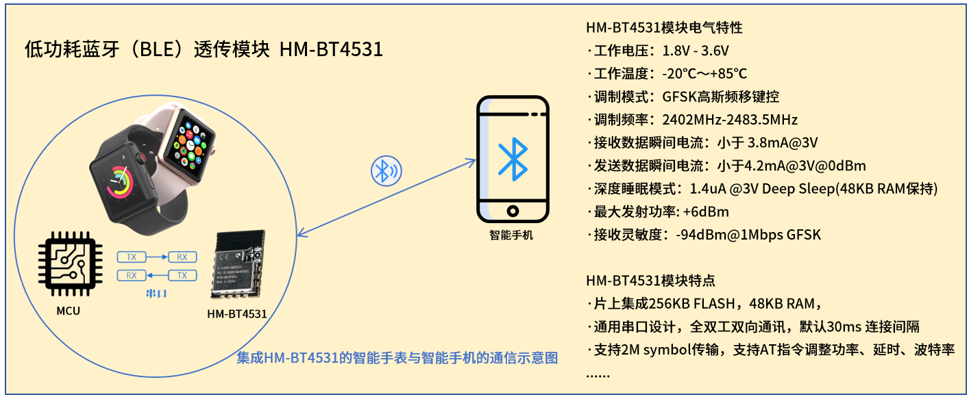 HM-BT4531基于新一代高性能、超低功耗蓝牙5.2芯片CMT4531,采用32位ARM® Cortex®-M0 内核最高频率64MHz片上集成48KB SRAM 256KB FLASH集成先进的5.2 BLE射频收发器,搭载集成PCB天线和外置天线座,支持无线数据透传功能,通过与外部MCU进行通信,可以快速实现BLE从设备与手机、平板等BLE主设备的无线连接和数据通信,外部MCU的资源占用低,可快速集成。