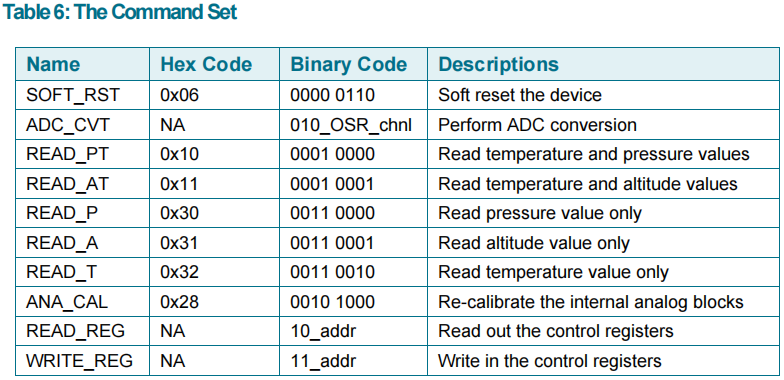 例如,通过向寄存器写入ADC_CVT指令(010, 3-bit OSR, 2-bit CHNL),即可设置传感器输出的数字信号类型(温度或温度与气压)及其内部的OSR过采样率。
