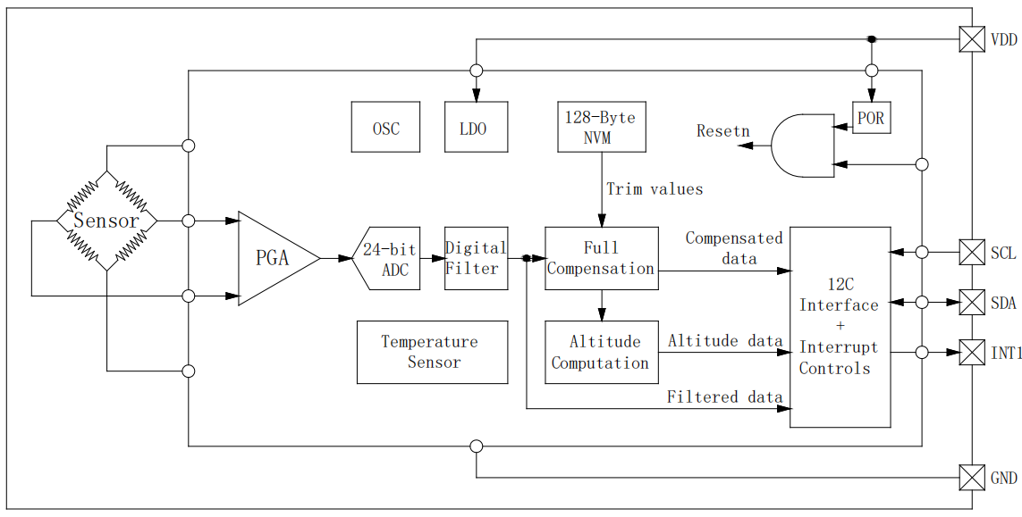 HP206W的压力和温度数据输出通过高分辨率24位ADC进行数字化,高度值则是通过特定专利算法根据压力和温度数据计算得出。