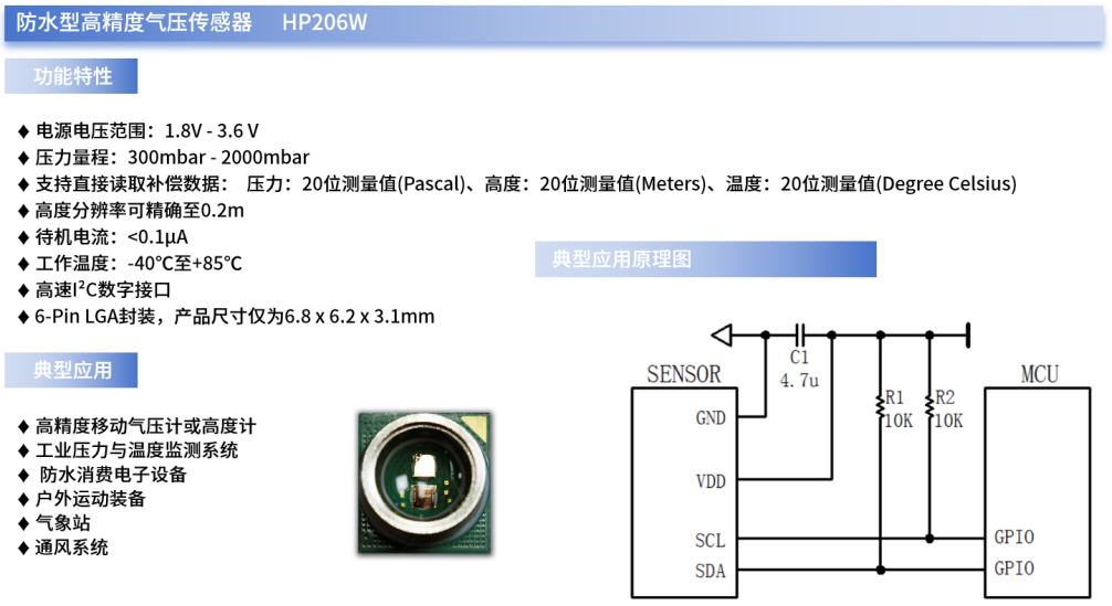 例如,350VIP浦京微自主研发的HP206W就是一款可同时精确提供气压、温度与高度数据的,带I²C接口的防水型高精度数字气压传感器。