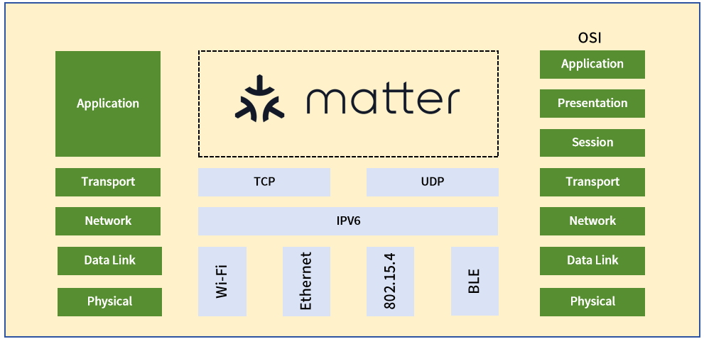 如上图所示,Matter标准是一个应用层协议,其本身并不定义新的通信协议,而是复用成熟的TCP/IP协议族(TCP/UDP为传输层协议,IPv6为网络层基础),因此采用Matter标准的智能家居设备只需遵循统一的应用层规范,即可兼容Wi-Fi、Thread、BLE与以太网等基于IP技术的底层通信协议。